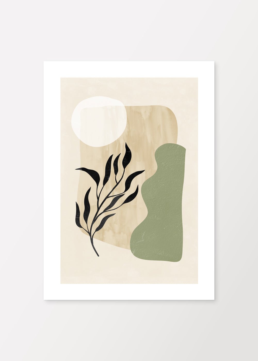 Tavla i gröna och beiga nyanser med inslag av växtlighet. Abstrakta former möter förställande siluett och skapar balans i motivet. Se fler gröna posters.